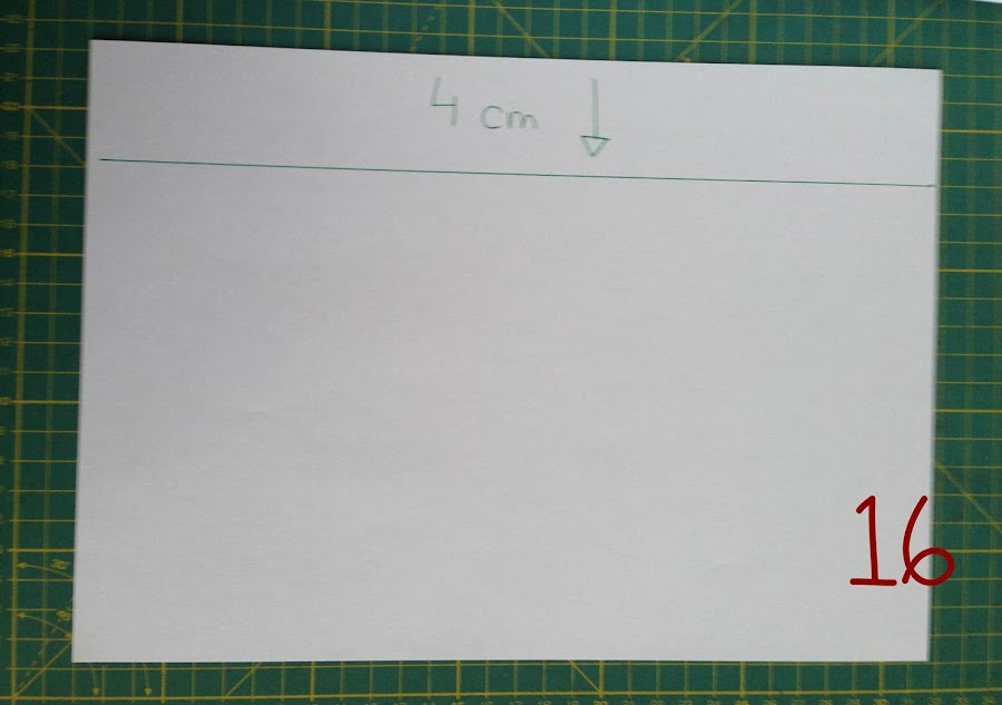 17. Coloca el folio encima del revés de la tela y dobla la parte de arriba de forma que el borde de la tela coincida con la línea marcada. Plancha para marcarlo. Dobla de nuevo el extremo de la tela hacia dentro y vuelve a planchar, así dejamos el borde "encerrado" para que no se deshilache. Desdobla este segundo doblez.