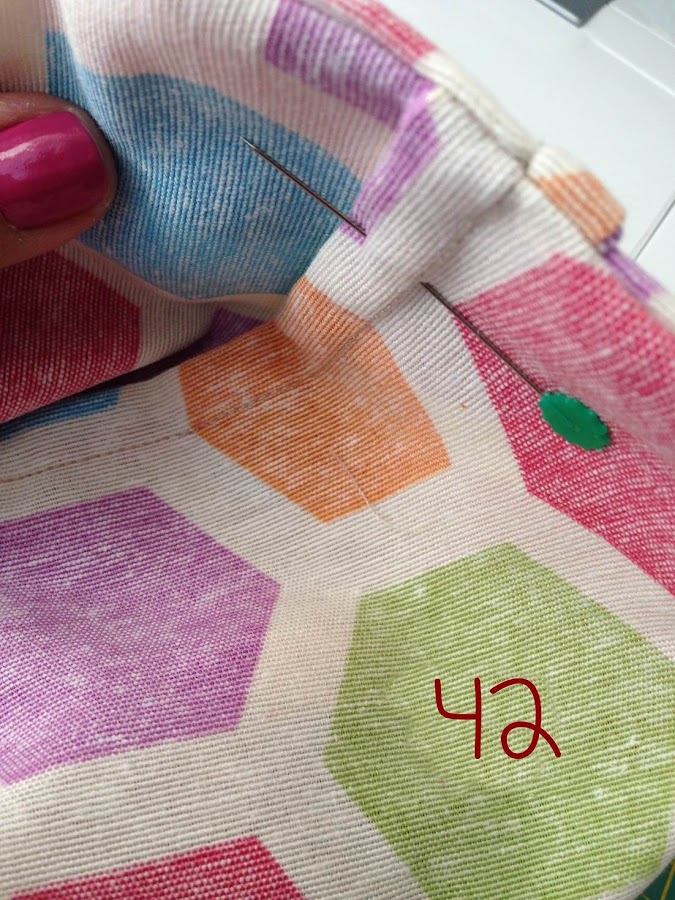 37. y aquí está el meollo, para que te quede bien el alfiler tiene que salir por la costura. Cuando lo consigas, asegura con un alfiler.