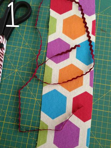 6. Para que no se deshilache la loneta tenemos que "encerrar los bordes", si tienes una remalladora/overlock puedes remallarlo, pero vamos a suponer que sólo tienes una máquina de coser normal. Usaremos un punto en Zig-zag con puntada pequeña, fijándote bien en que un lado de la puntada te quede justo en el borde de la cinta: