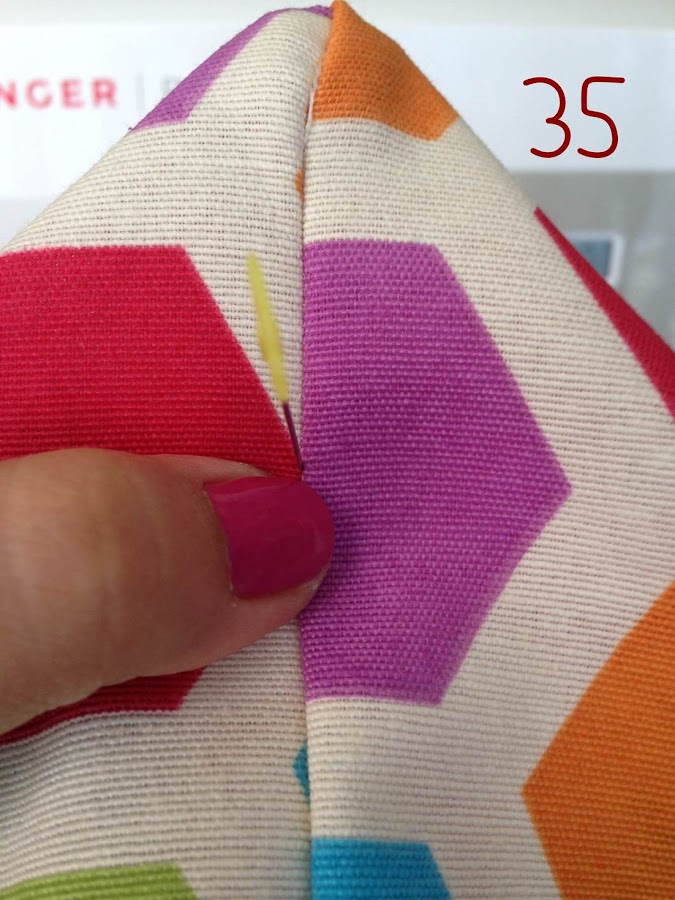 35. Forma un triángulo con la esquina inferior, y clava un alfiler sobre la costura