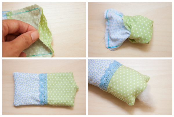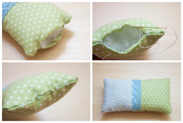 5. Dale la vuelta la tela por el espacio que habías dejado sin coser y rellena el interior del alfiletero de guata, de forma que quede como un cojincito.