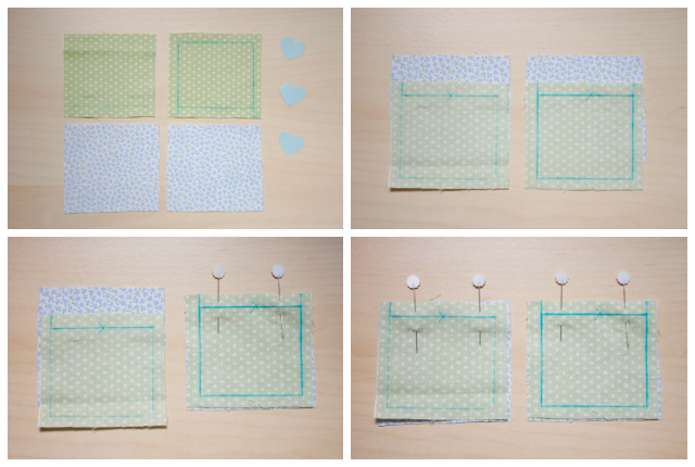 1. Recorta dos trozos de 8 x 9cm de cada una de las telas que vayas a utilizar y dibuja con el marcador de tela las líneas por dónde irá la costura a 1cm del borde. Encara los derechos y sujeta con alfileres en la zona donde quieras que se vean unidas las telas en el alfiletero. Como la zona a coser es pequeña no es necesario hilvanar.