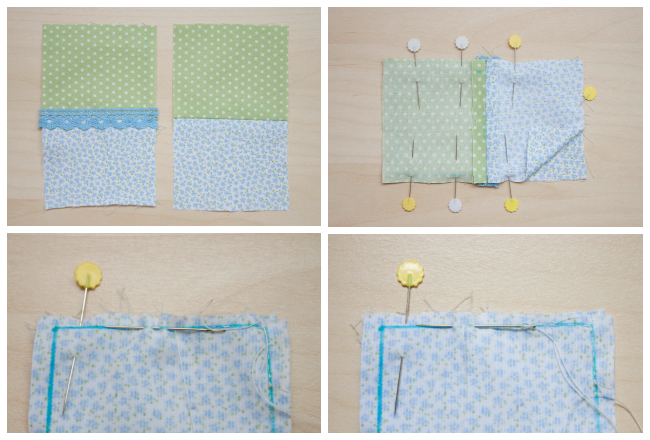3. Haz lo mismo con la parte trasera del alfiletero pero sin poner puntilla. Una vez cosido y planchado, encara los derechos, sujeta con alfileres y cose todo el contorno con hilván pequeñito a 1cm del borde, excepto un espacio de 3cm. Un consejo: de vez en cuando haz una puntada de pespunte para darle más seguridad a la costura.