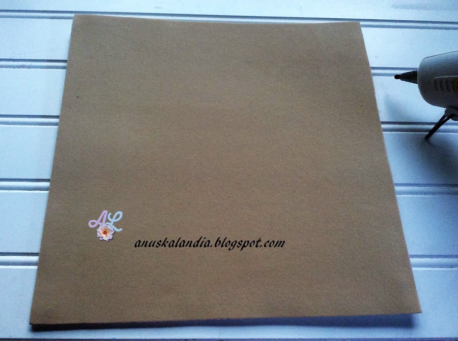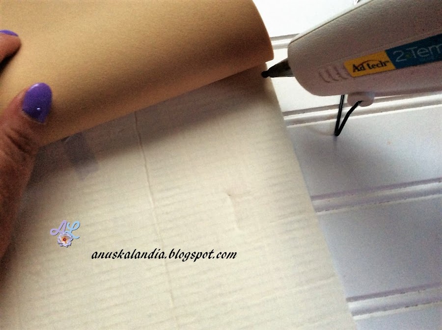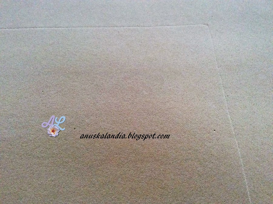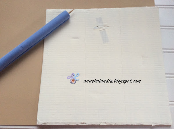 3.- Con una lámina de goma eva de color marrón piel, la colocamos sobre el cartón, para tomar la medida del frente del cuadro, marcando con un palito de brocheta. Recortamos. Pegamos en el frente del cartón con silicona caliente.