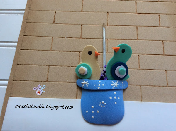 10.- Ponemos pegamento en la parte inferior de cada pájaro. Pegamos en el interior de la maceta.