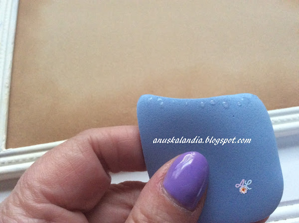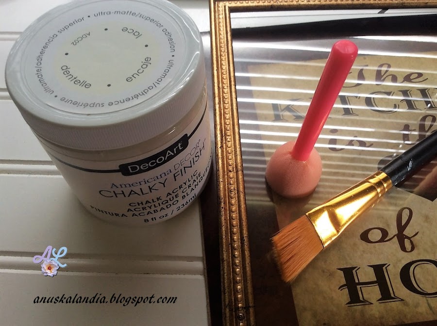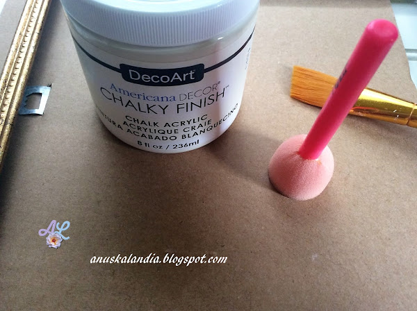 1.- Cogemos el marco de fotos, de la medida que hayamos elegido. En mi caso, 25 x 25. Retiramos cristal y lámina. Nos quedamos con el cartón trasero y el marco propiamente dicho. Pintaremos la trasera del cartón del color de nuestra elección. En mi caso he utilizado Chalk paint encaje de Americana tanto para el cartón como para el marco, puedes utilizar acrílica si gustas para el cartón. El primero con brocha y el segundo con esponja.