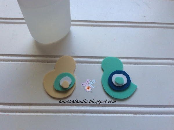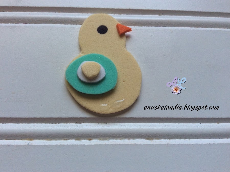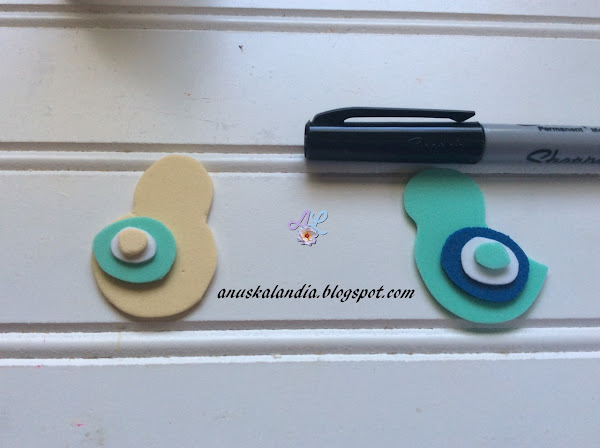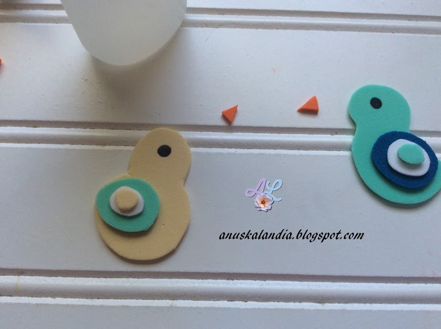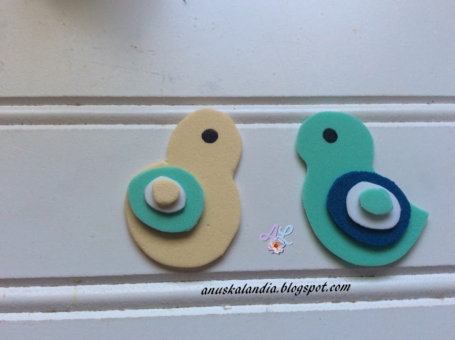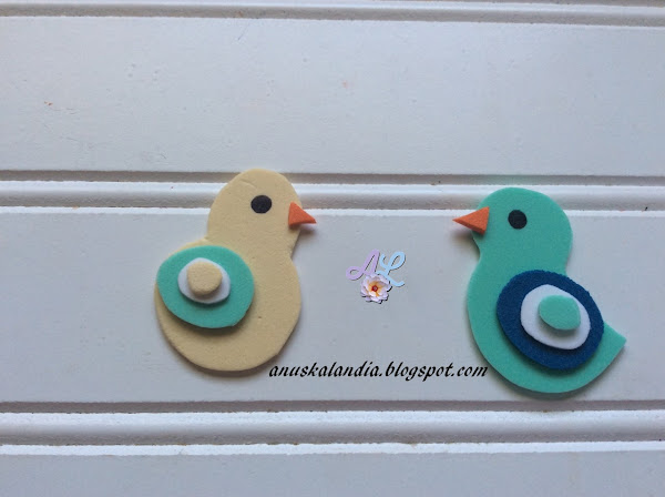 8.- Vamos a montar los pájaros. Pegamos las partes como se ve en las fotos. Marcamos con rotulador negro permanente, los ojos. También pegamos los picos naranjas.