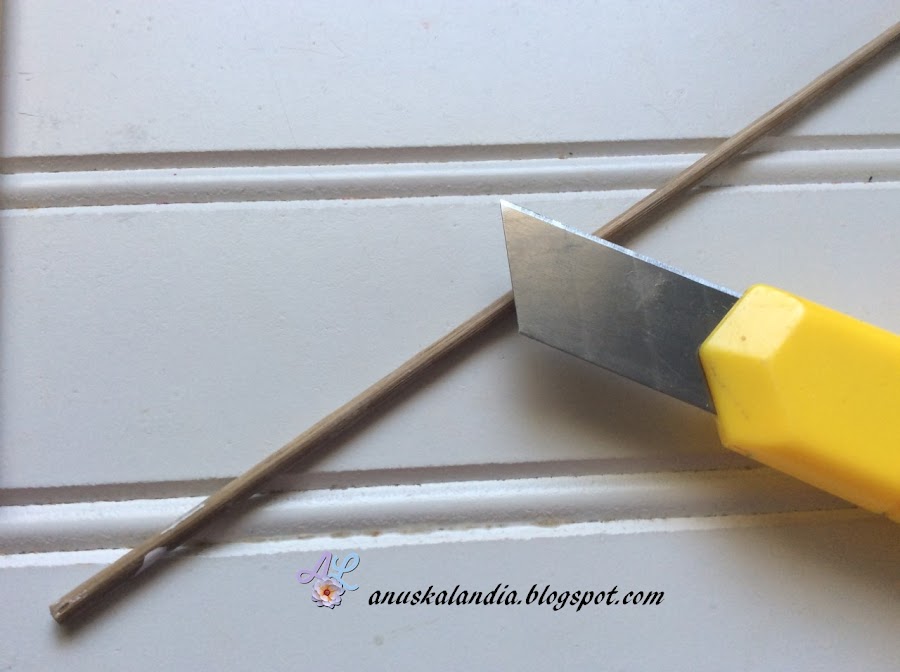 11.- Cortamos un palito de brocheta a una altura de 10 cm. Pintamos un poquito de blanco. Le ponemos un poquito de Tacky Glue y pegamos al fondo de ladrillos, dentro de la maceta. También decoramos la maceta con pintura y la parte posterior del palito de brocheta.