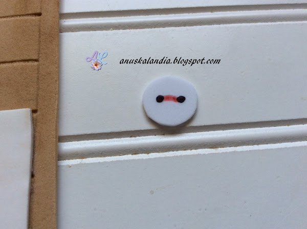 13.- Cortamos un círculo del tamaño de una moneda de centavo de dólar o céntimo de euro, para decorar, como si fuera un botón en goma eva blanca. Con rotulador permanente negro, hacemos dos círculos, con un bolígrafo rojo, pintamos "las puntadas" de hilo. Ponemos pegamento instantáneo en la parte trasera. Pegamos en el centro de los pétalos.