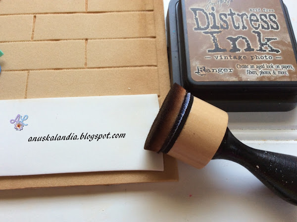 6.- Pegamos una tira blanca a las dos filas de abajo, con pegamento instantáneo, como si fuera una mesa. Sombreamos un poco con la tinta de scrap.