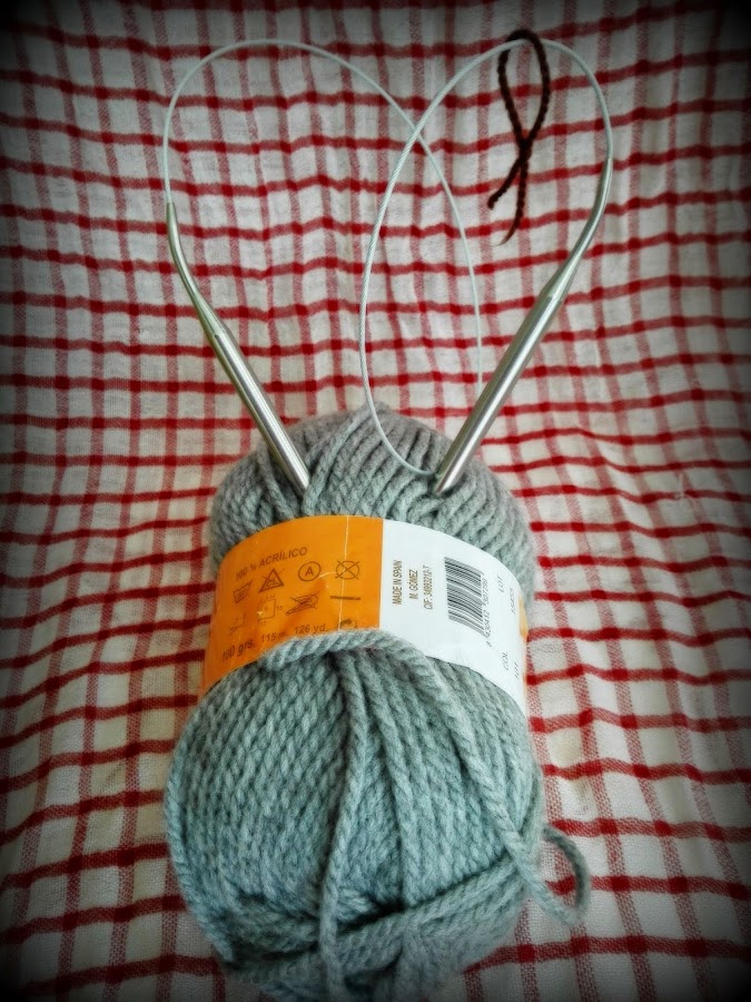En agujas circulares del nº 8 montamos 68 puntos los deslizamos sobre la aguja hasta llegar al otro extremo impidiendo que se salgan. Pondremos especial atención en que todos los puntos queden derechos y ningún punto quede torcido al unir el comienzo con el final de la primera hilera.