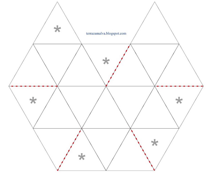 En la imagen superior podéis ver se ha de formar casi un hexágono (sobra una zona de la parte superior). Las lineas que he resaltado en rojo son cortes que han de realizarse. El resto de líneas interiores corresponden a los dobleces que hay que realizar. Los símbolos márcan las partes triangulares que irán solapando sus adyacentes.