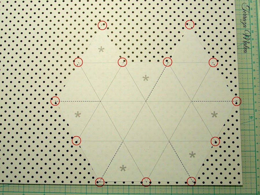 He situado la plantilla sobre la cara interior de la cartulina y he marcado unos puntos finos en los vértices de los triángulos exteriores. Por si no se veía bien en la foto, he marcado estos puntos con unos círculos rojos para que sepáis cuales son necesarios (haced puntos finos, que se vean lo suficiente pero sin pasarse...).
