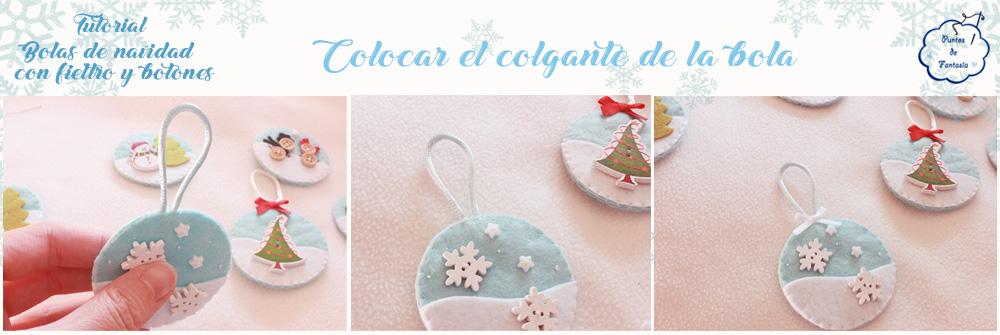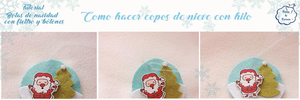 Uno de los detalles que más personalidad navideña dará a estas bolas de fieltro, serán la simulación de nieve. La realizaremos con hilo de coser blanco, en doble hilo. En la imagen podéis ver como lo hemos hecho, es dejar el nudo visto (nosotras hemos hecho dos nudos para darle más relieve) y esconderlo.
