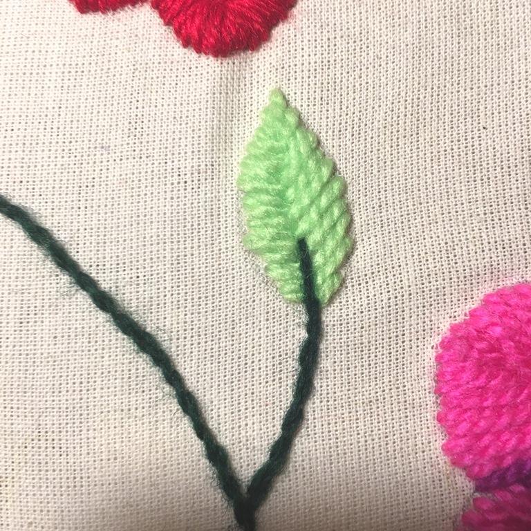 Para realizar las hojas, bordamos también con punto relleno con la variante que comenté para los pétalos del bordado peruano. Para ello te recomiendo marcar con lápiz el centro de la hoja, como podés ver en las fotos.