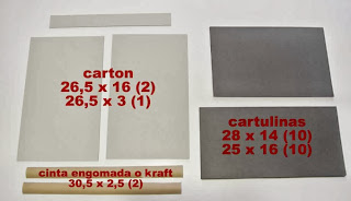 Material: cartón, cartulinas, cinta engomada o papel kraft, cola, fabric tape, cinta/lazo y papel decorativo.