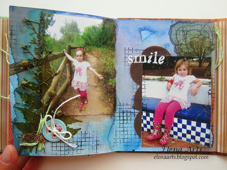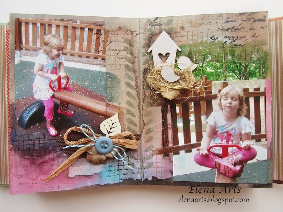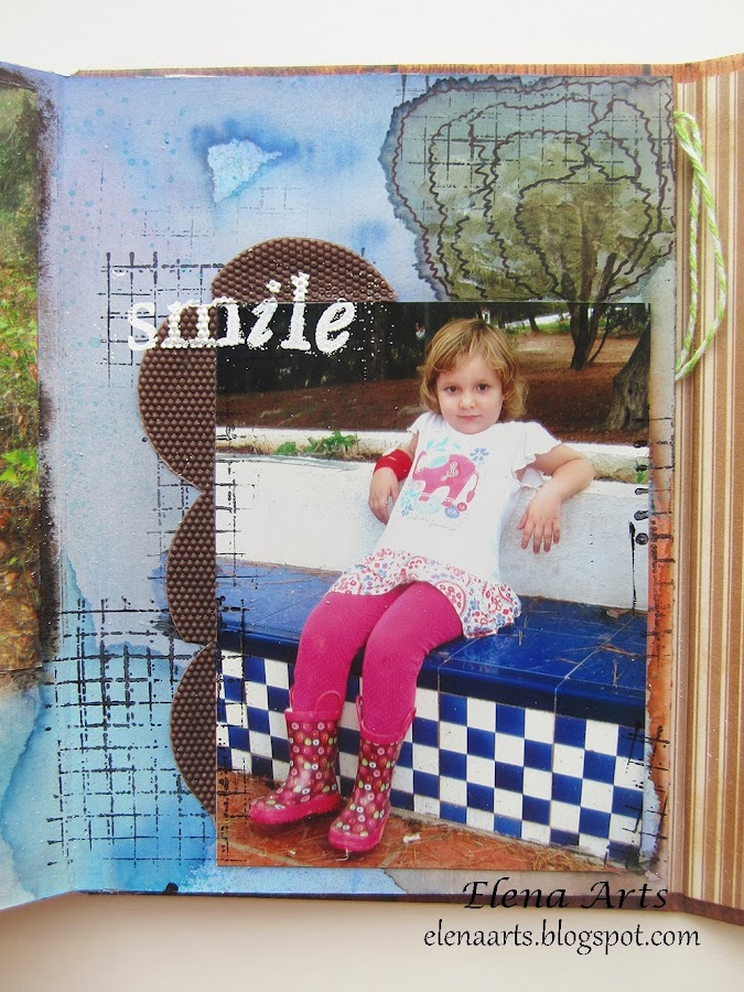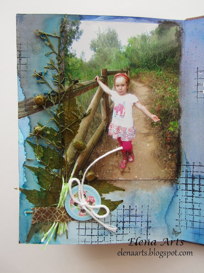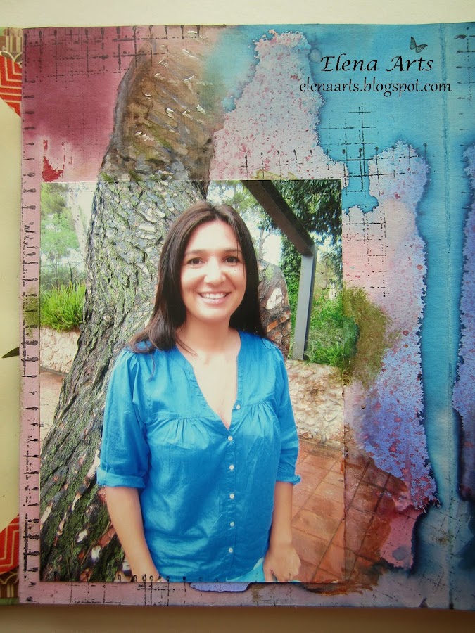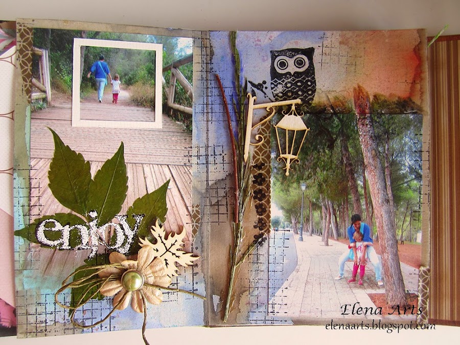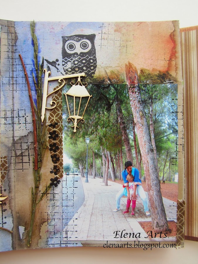Y volviendo a las páginas... Podemos añadir algunos sellos, o incluso, si teneis carpetas de embossing con algún dibujo que os guste, podemos estamparlo igual.