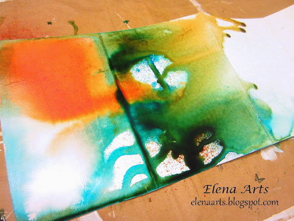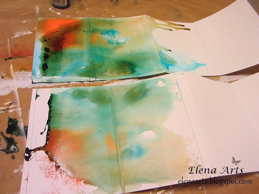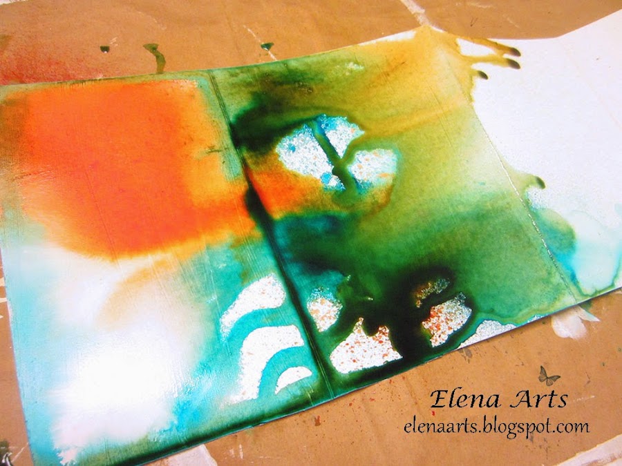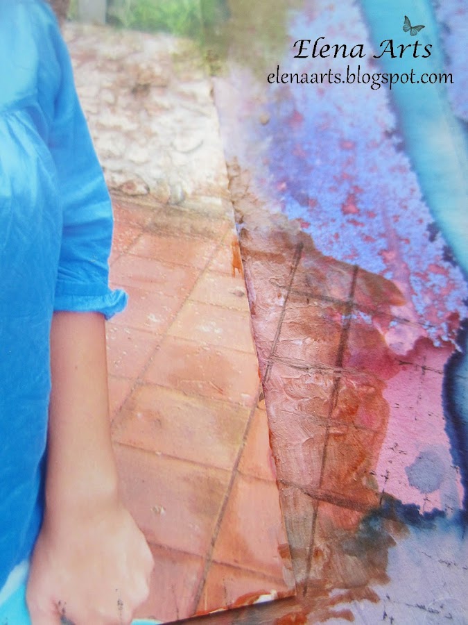 Yo hice una hoja con los colores verde+azul+naranja y después la estampé en otra hoja. Así conseguimos adelantar el trabajo y ahorrar el material :) Id experementando y sobretodo pasadlo bien! Si no os gusta el resultado, siempre se puede esperar que se seque y pintar de nuevo. OJO! procuraremos usar los mismos colores que llevan nuestras fotos. De esa manera conseguiremos el resultado mucho más bonito y bien conjuntado.
