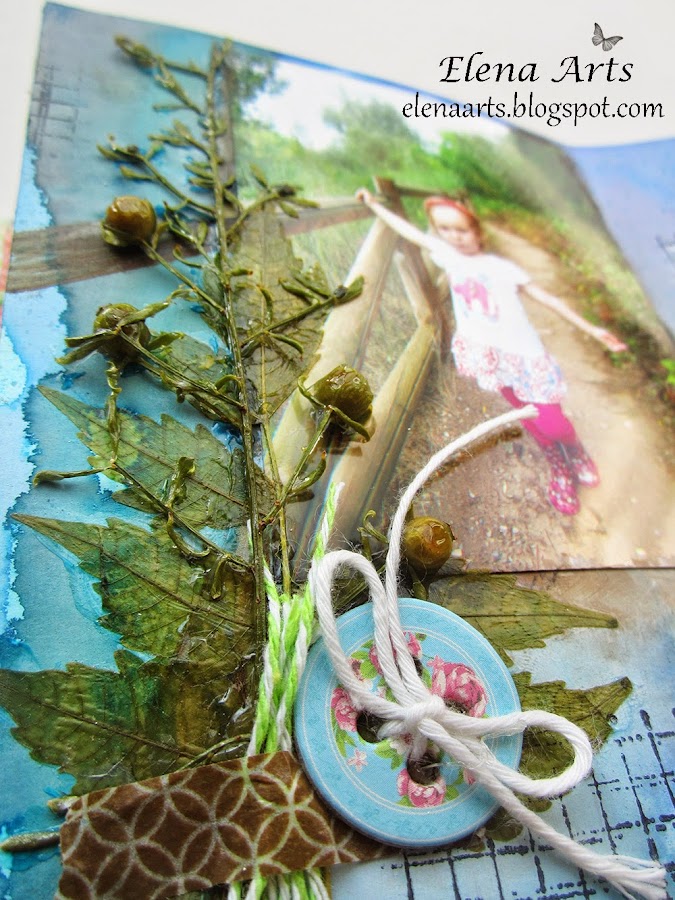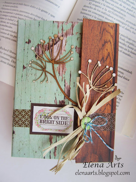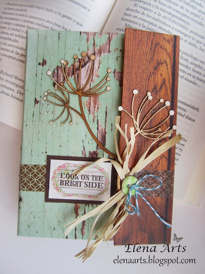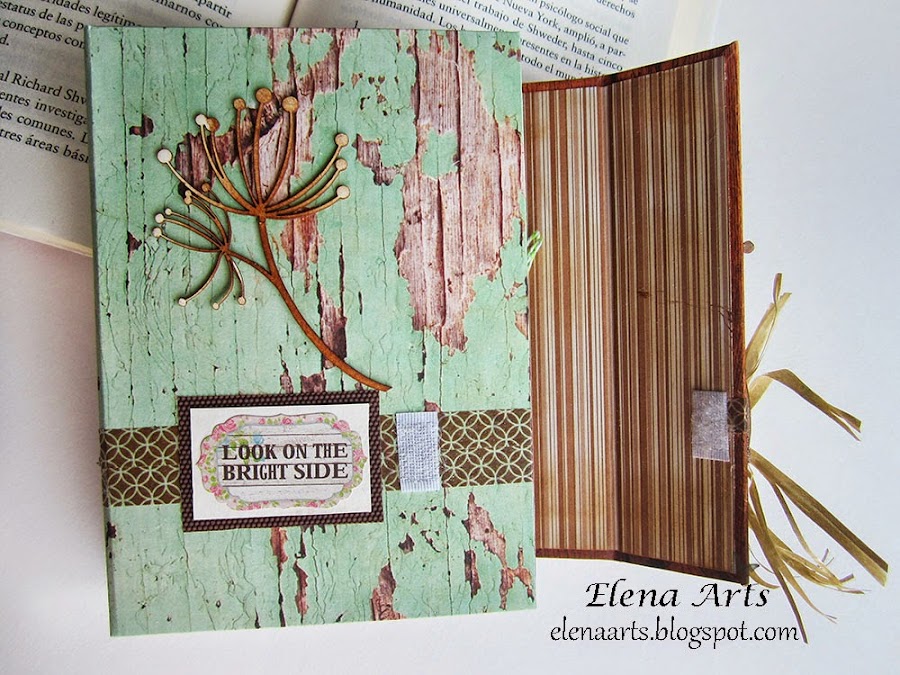 Decoramos nuestra tapa. Yo puse un par de chipboard de perejil, washi tape, una pegatina de Bo Bunny "look on the bright side", un botón, un poco de rafia y un hilo azul.