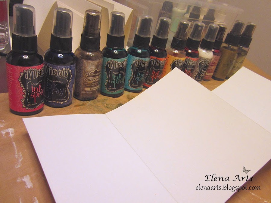 Y ahora lo más divertido!!! Una vez seco el papel, vamos pintandolo con los diferentes sprays. Si no los teneis, no os preocupeis! Se puede usar la pintura acrílica o de acuarela. Se diluye con agua y se pone en un aplicador de spray.