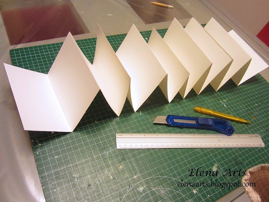 Necesitaremos papel de base para nuestro álbum. Así que cogemos 2 hojas de A3 (de unos 30x42 cm) de 200 gm de grosor, y las cortamos por la mitad, de tamaño 15x42 cm cada una. Después plegamos cada tira de la siguiente manera: 11+11+11+9 cm. Haremos lo mismo con las 4 hojas.