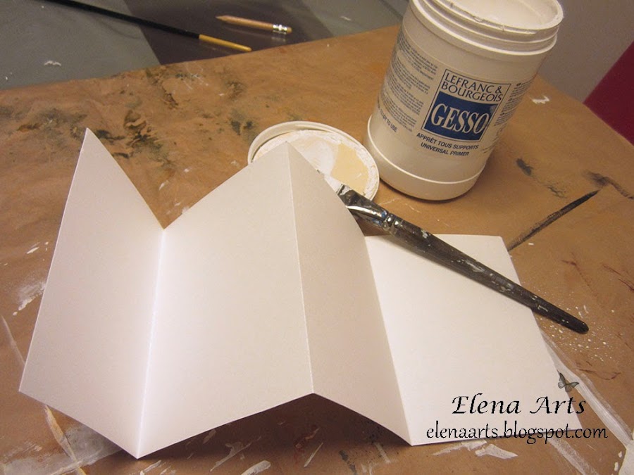 Ahora cubrimos con el gesso blanco la superficie de nuestro fondo. Lo hacemos para que al aplicar posteriormente los tintes y el agua, no se nos deforme el papel.