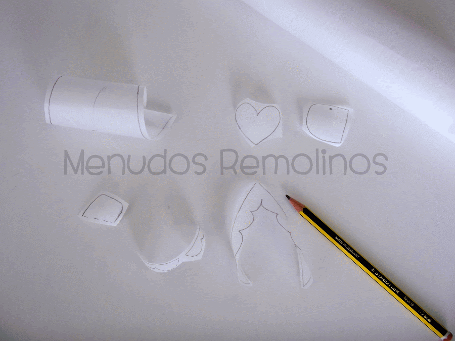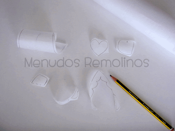 2. Recortamos cada una de las piezas que hemos dibujado. IMPORTANTE: no recortéis justo por la línea del dibujo. Dejar un poquito de papel a los lados.