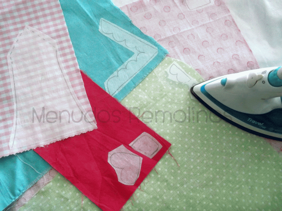 Y una vez tengamos elegidas las telas, fijamos cada pieza con la plancha a su tela correspondiente. IMPORTANTE: Hay que pegarlas en el reverso de la tela