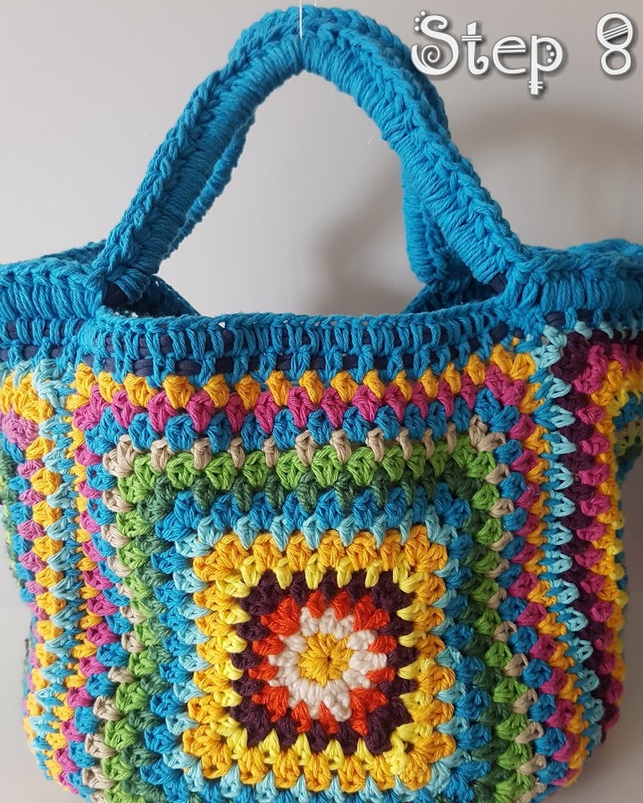 Paso 7: Unir los laterales, para ir cerrando el bolso, cogerá forma cúbica. Después rematar con hilo en este caso azul para hacer el asa, con 3 o 4 vueltas de refuerzo.
