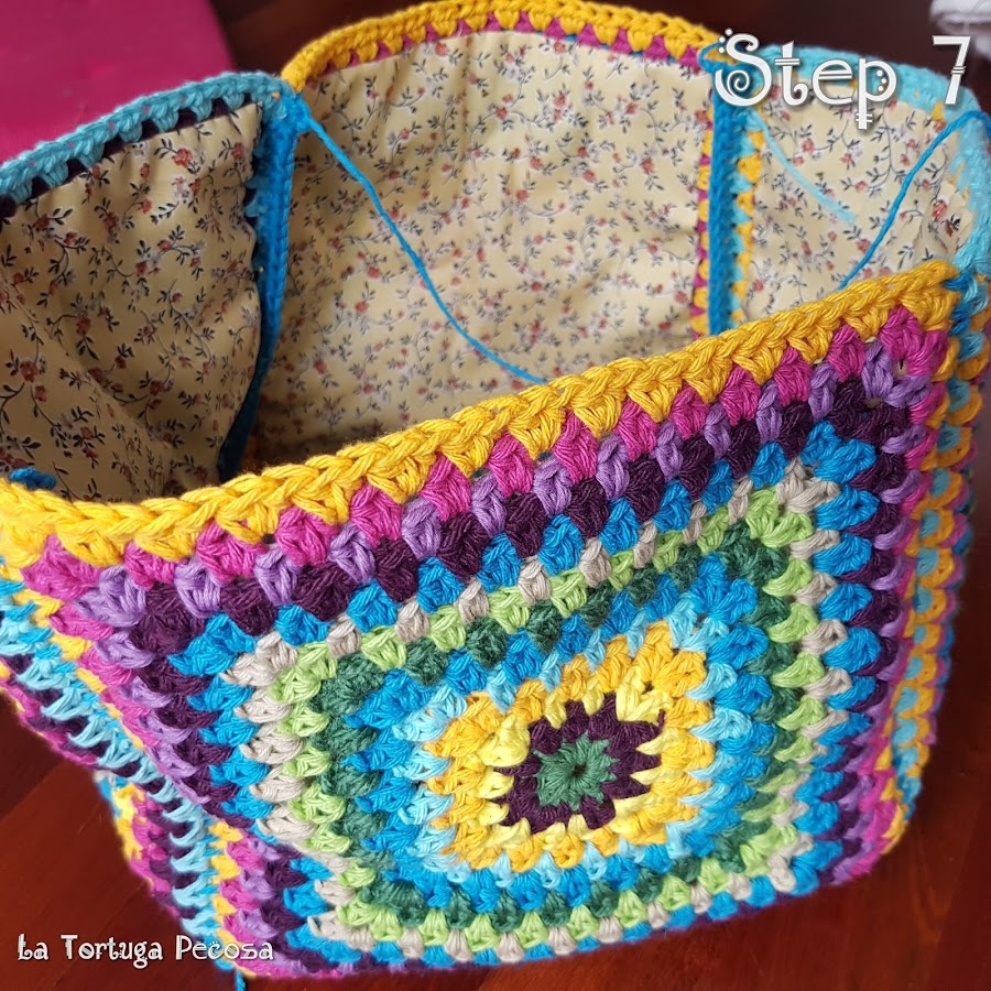 Paso 2: debemos escoger unas telas de patchwork chulas pues, serán el interior de nuestro bolso, adaptando cada tela y cosiendolo a cada cuadradito de granny, teniendo en cuenta que el diseño de la tela mira a nosotros. En este caso, los laterales van con tela de flores y la base de color azul pues la tela era superresistente.