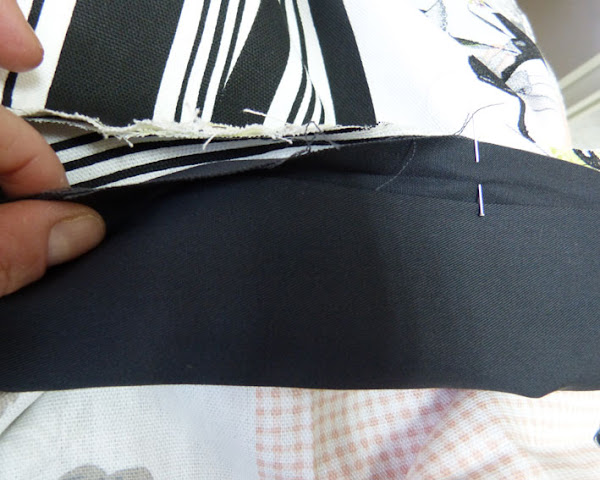 Colocamos la cara del bies sobre el reves del ruedo de la falda y cosemos.