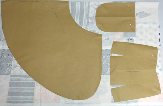 Colocamos los patrones sobre el tejido principal. Primero colocamos el patrón de la falda, poniendo el centro delantero en el lomo de la tela.