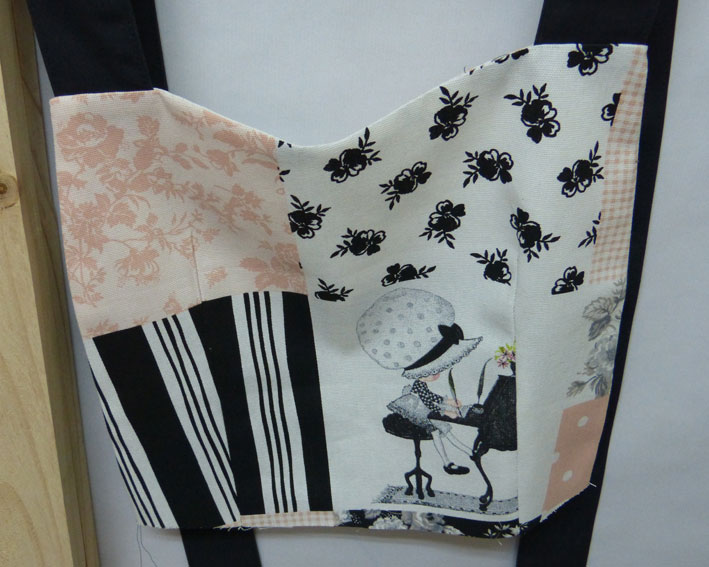Ahora ponemos la otra parte del pechero de manera que veremos los dos reveses del pechero y los tirantes quedarán dentro.