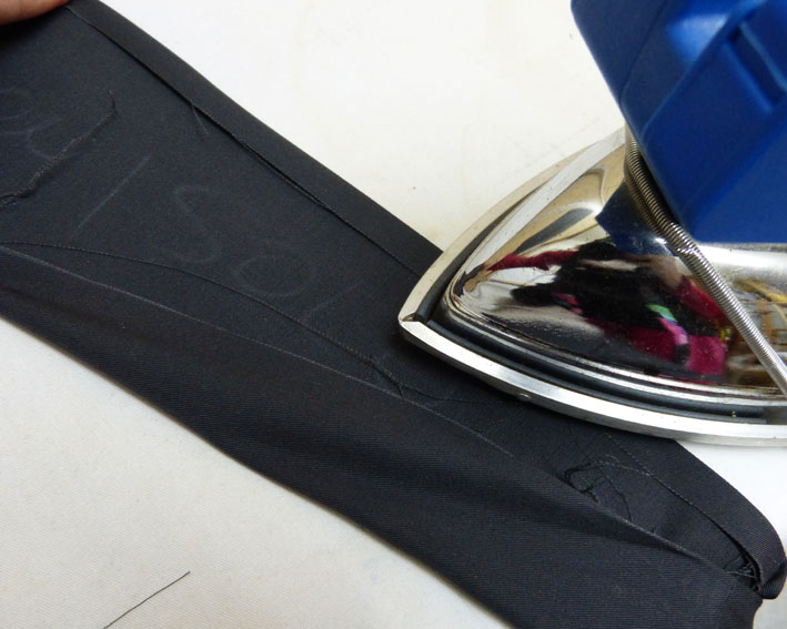 Planchamos también el cinturón. En la pieza central que queda sin coser, doblamos un centímetro hacia adentro.