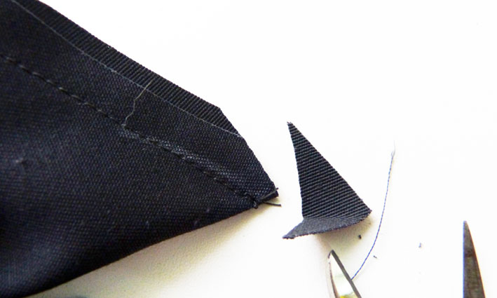 Cortar las esquinas de los tirantes y del cinturón para que al dar la vuelta no nos queden excesivamente abultadas. Hay que tener cuidado para no cortar mas de lo debido ¡prudencia!.
