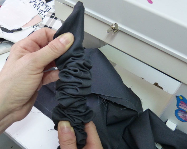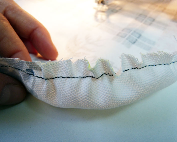 Una vez tengamos pasado el pespunte, tiramos de un extremo del hilo, nos resultará fácil, porque no hemos rematado y porque la puntada es larga, y al haber cosido solo una capa de tela, la puntada nos queda floja.