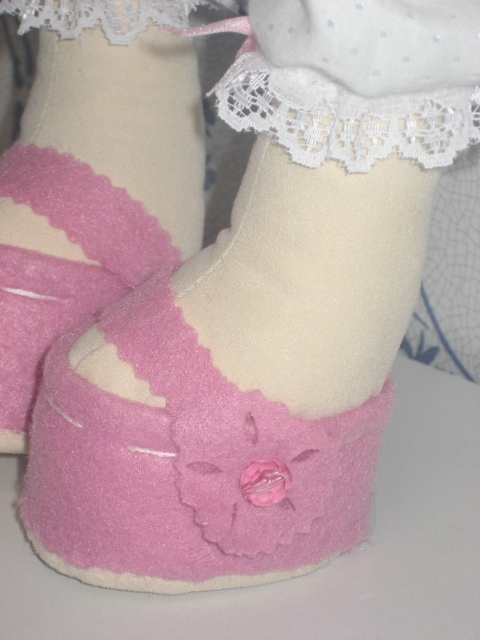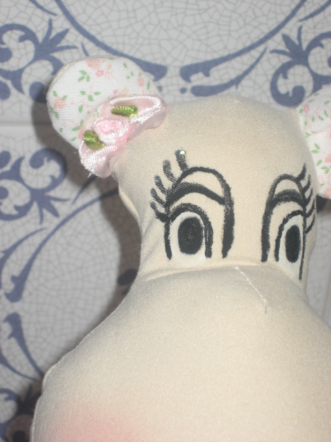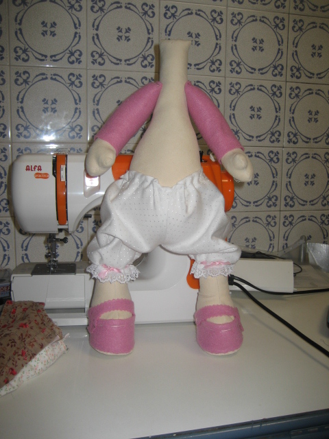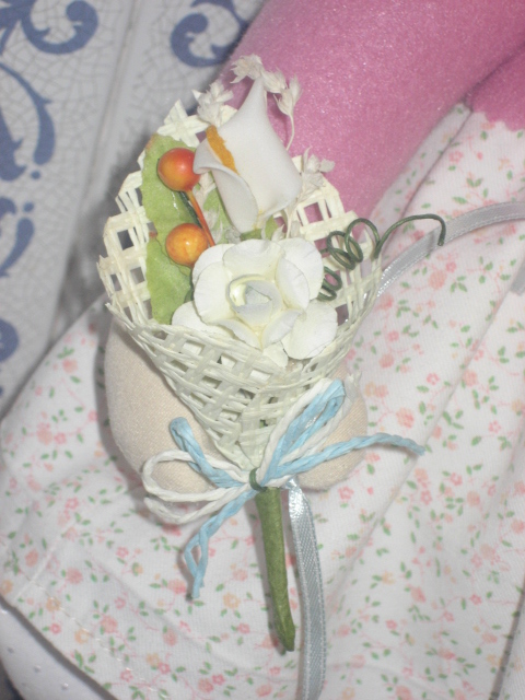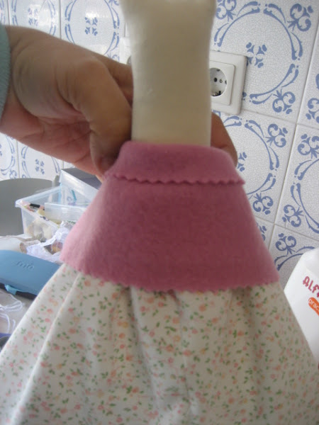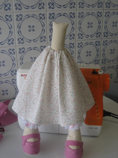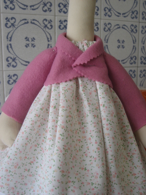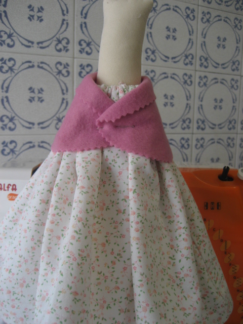 Antes de terminar quería comentaros que la tela para el vestido y los detalles del broche y el adorno de la cabeza fueron reciclajes de un vestidito de mi niña y de una diadema de cuando era bebe.