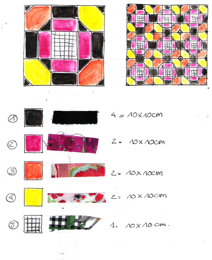 The entire block is worked with squares of 10X10cm (1). Although you are attaching the pattern, the measures and quantities, you will give a preview: we need in 3 different patterned fabrics 2 squares of each; another 1 squarein patterned cloth and, finally, in a smooth cloth or with a small print, that simulates a fake smooth, 4 squares.