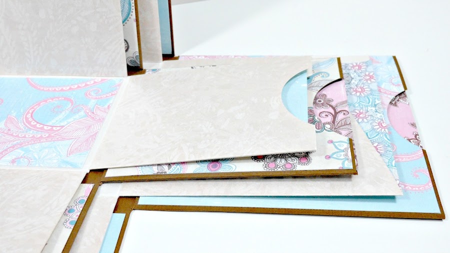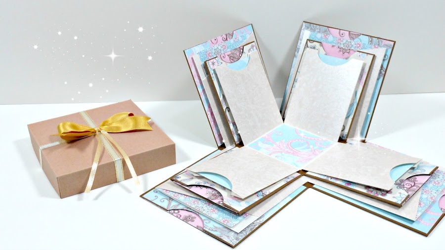 Este tipo de mini álbum de compone de varias capas, todo dentro de la estructura de caja. Lo bueno que tiene esta estructura es que deja un espacio en el centro para que podamos incluir un pequeño objeto, ya sea un regalo pequeño, caramelos o bombones.