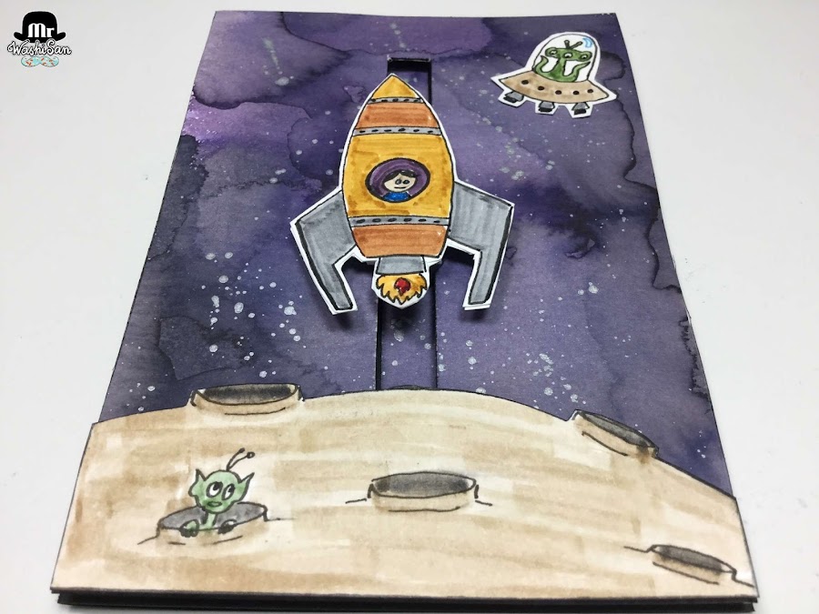 Además he dibujado con un rotulador permanente (micron de sakura) el cohete unos marcianos y la base de la luna y los he coloreado con los rotuladores Tombow. Los he recortado y luego pegado en su sitio; el cohete lo he unido al imán que circula por el interior de la ranura y la luna cubre el imán que está fijo la tarjeta.