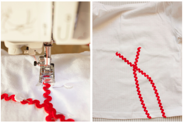 1. Para esta idea - Coloca la ondulina o piculina (depende de donde vivas se llama de diferente manera) sobre la camiseta, sujétala con alfileres y cose justo por el centro, de forma que no cojas la ondas. Si vas a coserlo:A máquina - escoge una velocidad baja con puntada recta y pon los alfileres perpendiculares a la dirección de costura, así no hace falta quitarlos mientras coses.