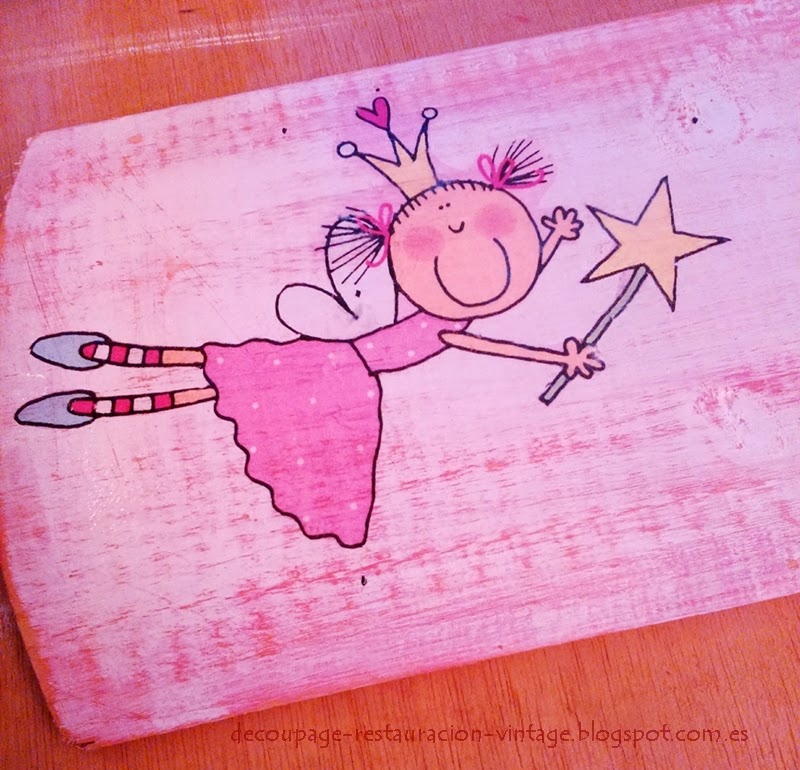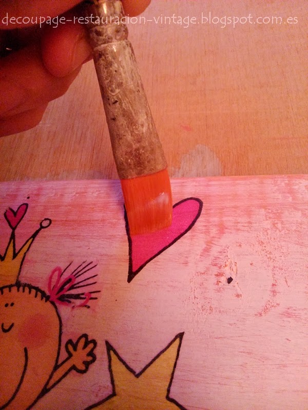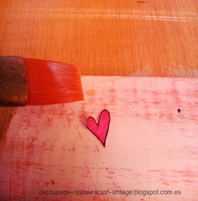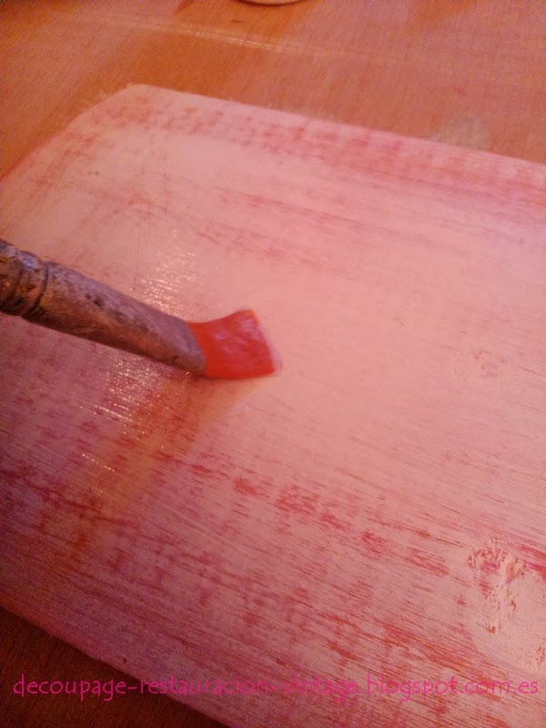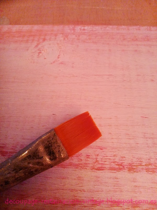 He preparado la madera pintando con una mano de color rosa y una vez seco he pintado de blanco. Luego he lijado por todo para decaparlo y ha quedado de color blanco y rosa desgastado.