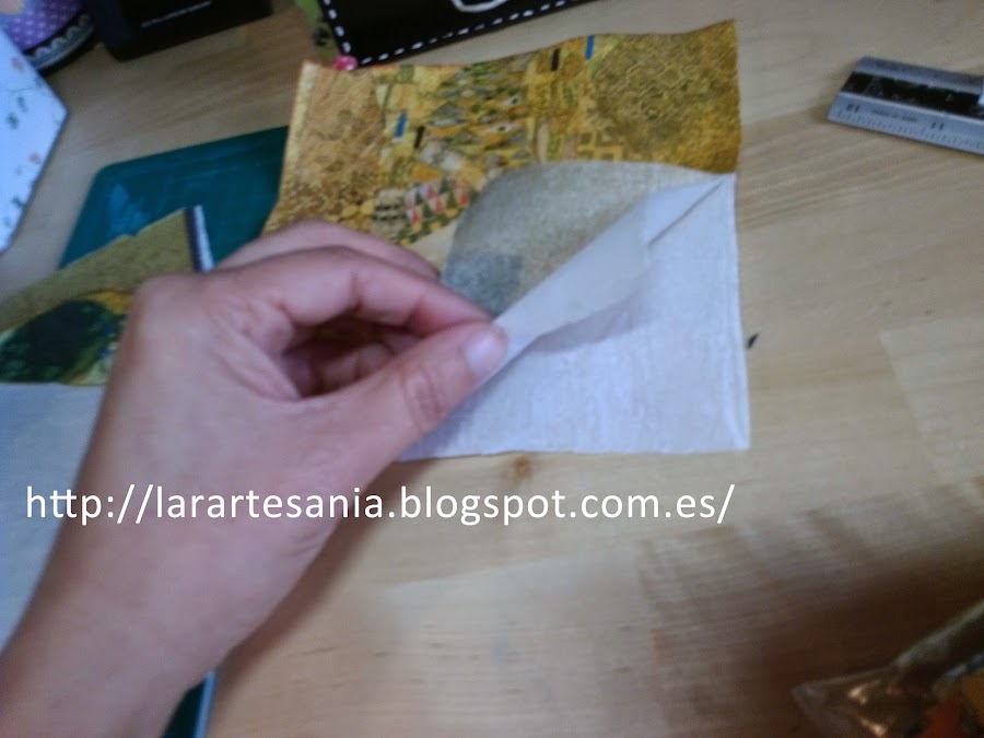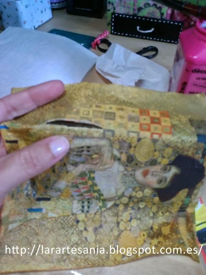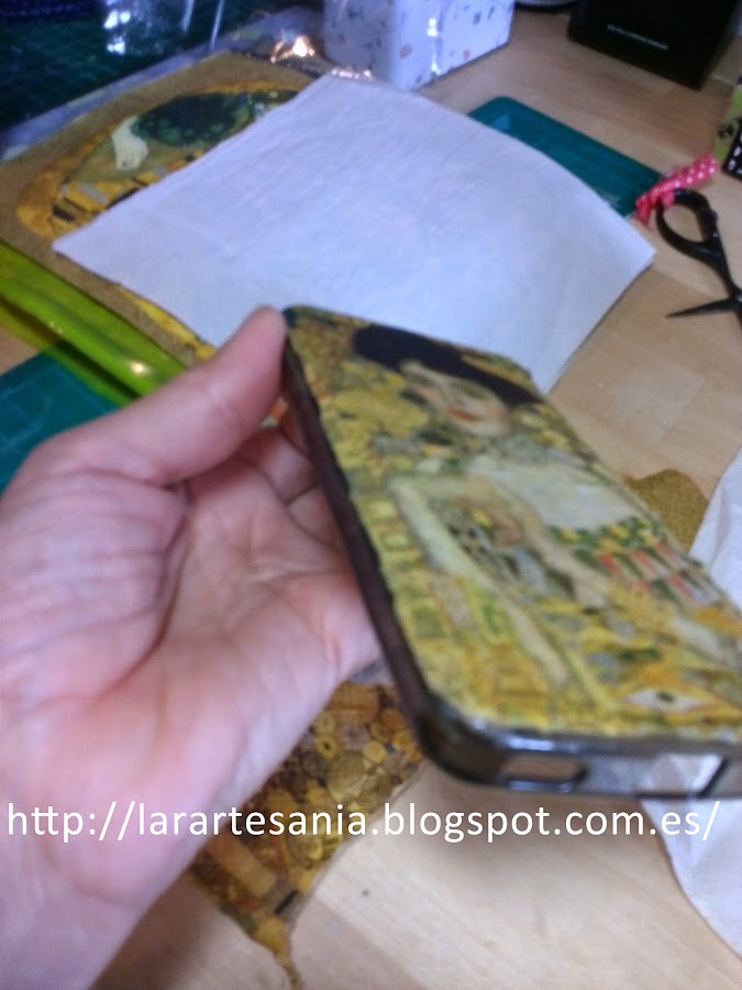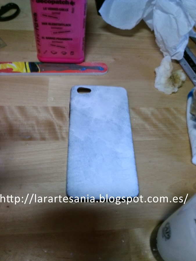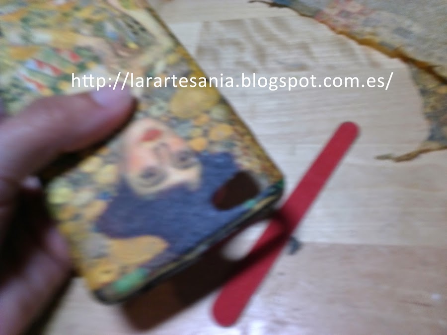 Con una lima de uñas con cuidado vamos cortando la servilleta sobrante, en este caso usamos la mas fina que encontremos para poder hacerla servir en la abertura que lleva la funda para la cámara