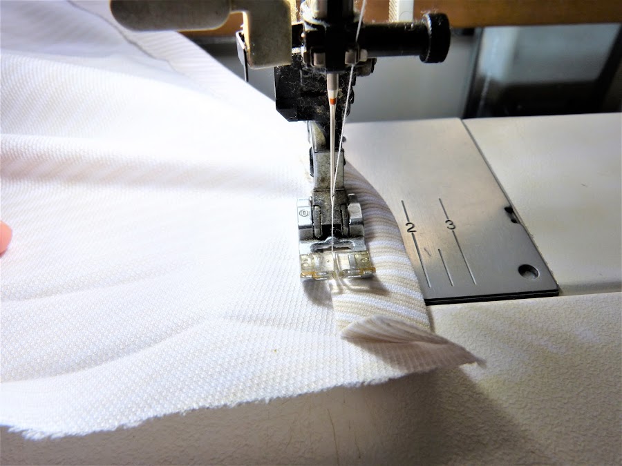 Marcamos con la plancha el dobladillo y canto trasero del delantal y lo cosemos con un pespunte.