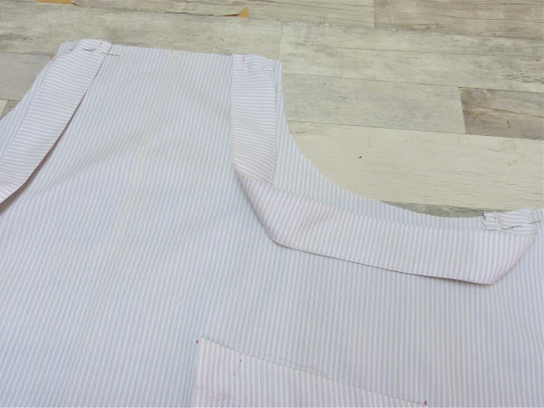 Colocamos la vista sobre el delantal, cara con cara y la unimos al delantal con una costura a un centímetro del borde.