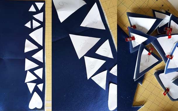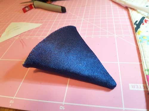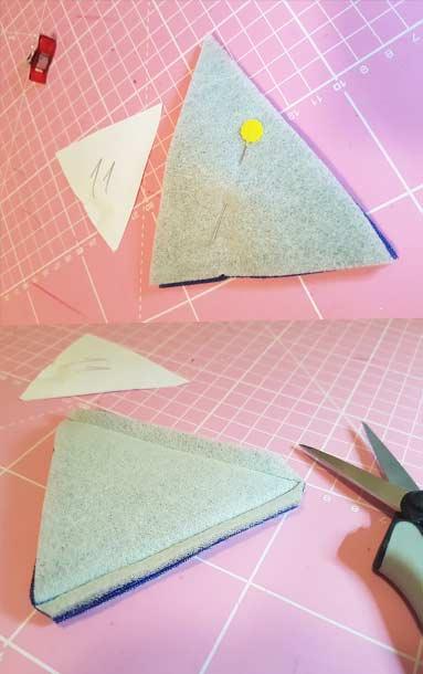 Los triángulos de la cresta los ponemos derecho contra derecho y cosemos 2 de sus lados, rebajamos esquinas y punta y damos la vuelta.