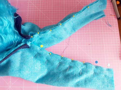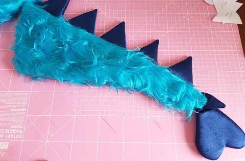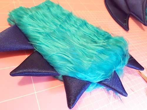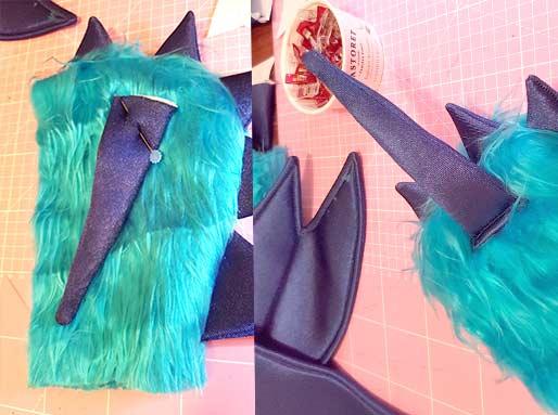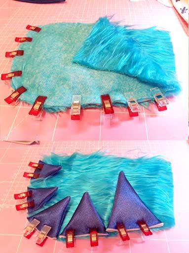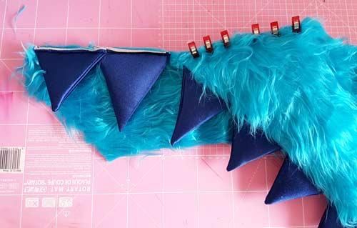 Por otro lado debemos ir colocando los picos de la cresta de la cola como veís en la foto, con pinzas o alfileres y cosemos.
