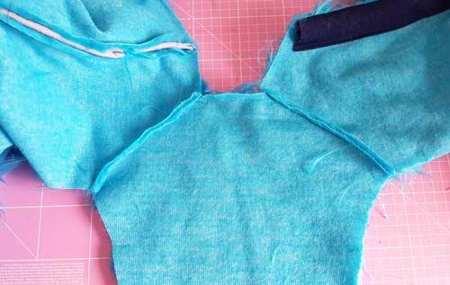 Enfrentamos las dos espaldas entre si, sujetamos y cosemos desde el cuello hasta el tiro.