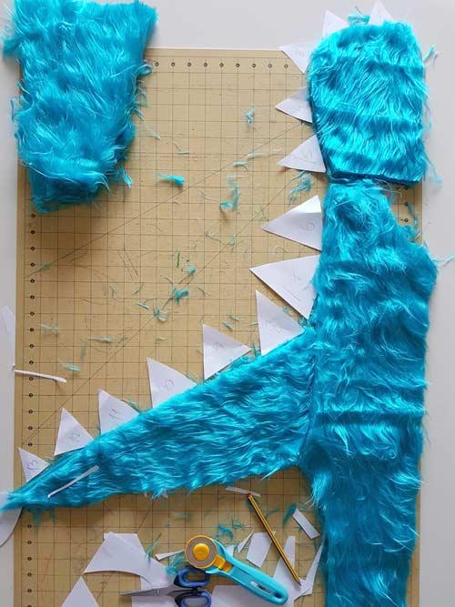 Tenia claro que queria un dragón, dinosaurio o similar y aunque el color no es el más parecido a un dragón me ha encantado el resultado. He de decir que la tela de pelo se cose muy bien por el revés pero por el derecho hay que ir muy despacito y tener cuidado de no enganchar ningún mechón. Ni que decir que es una tela que te va a poner el lugar de costura fino de pelusas…. (menos mal que el resultado lo merece). POr otro lado el Foam se corta y cose de maravilla y es un tejido rígido perfecto para hacer las alas, los cuernos y la cresta. este disfraz y su forma de confeccionar os puede servir de inspiración para hacer muchos más del tipo animales: león, dinosaurio, pero, oveja, monstruo, etc…