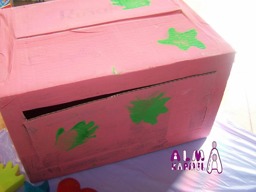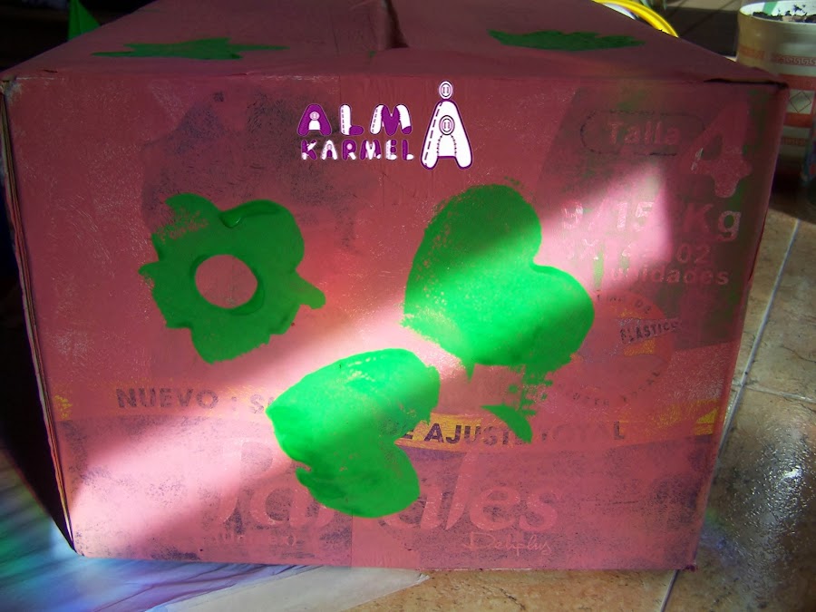 Lo ideal sería darle dos manos de pintura para que tape bien los dibujos y las letras de la caja, pero como la paciencia no es una virtud de mi niña, se quedó con una sola mano de pintura, jejeje